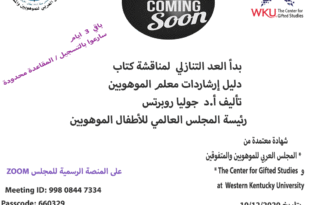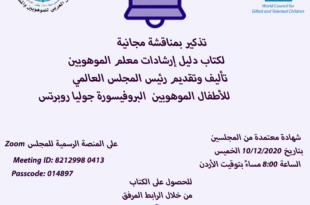 بقي يوم واحد لحضور مناقشة كتاب دليل إرشادات معلم الموهوبين تأليف وتقديم البروفيسورة جوليا روبرتس رئيسة المجلس العالمي للموهوبين للاطفال وذلك في يوم الخميس 10 ديسمبر 2020 في تمام الساعة 8 مساء بتوقيت الأردن مع مراعاة فارق التوقيت بالبلدان العربية : السعودية —-7:00 م الجزائر 7:00 م الشهادة معتمدة من …