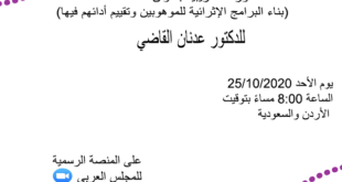 :نود تذكيركم بالدورات التي سوف يعقدها المجلس العربي بإذن الله في شهر اكتوبر/ تشرين أول القادم 📣⏰ دورة أ.د. خلدون الموصلي و أ.د ريكو تايلر بتاريخ 04/10/2020 بعنوان: (أساليب وأنشطة فعالة لزيادة التفاعل مع المحاضرات الإلكترونية :دورة د.علي الرشدي بتاريخ 11/10/2020 بعنوان (مقاييس ستنافورد بينيه للذكاء- الصورة الخامسة) :دورة د.عدنان …
